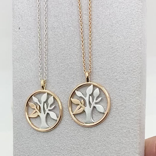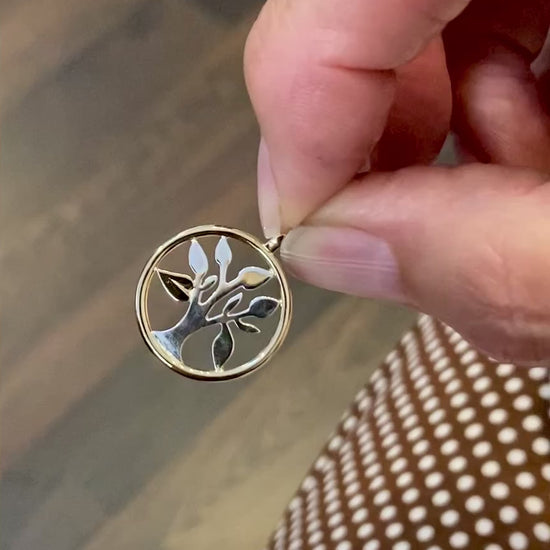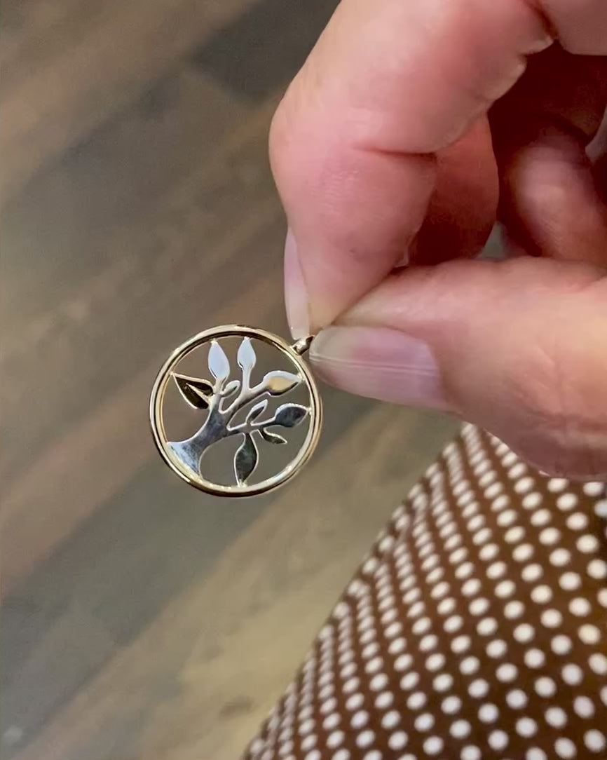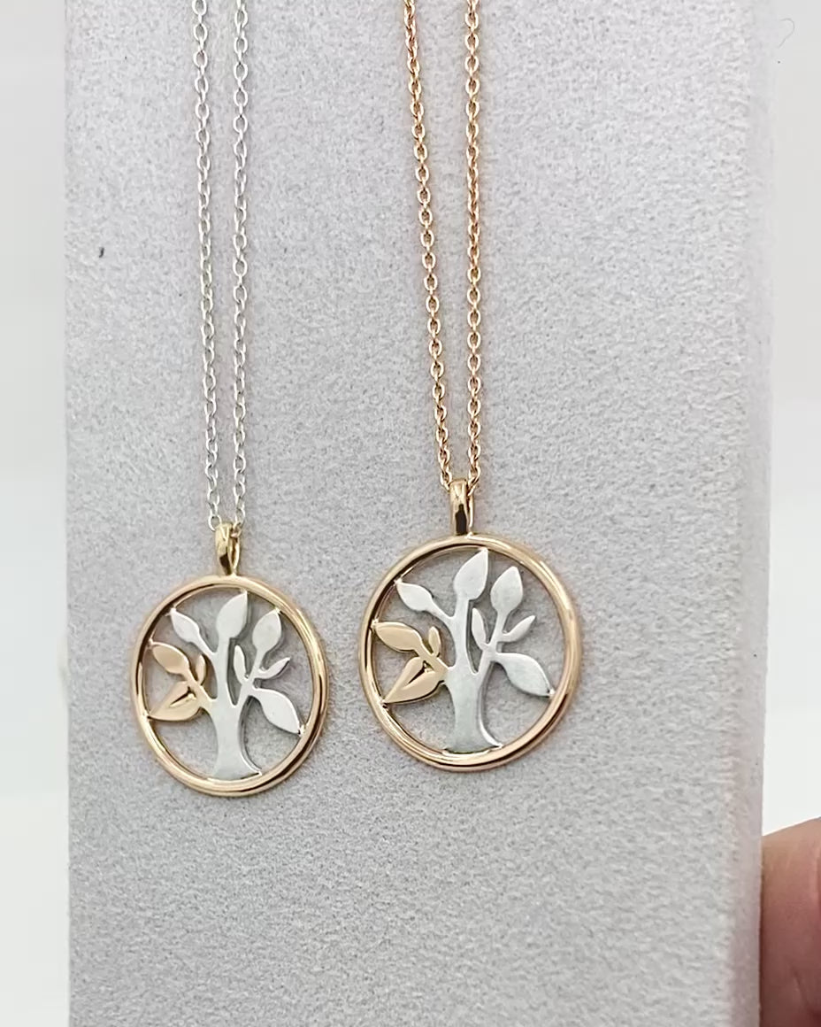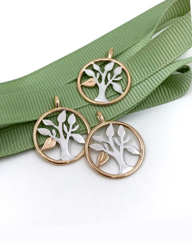 •3) Mix, silver träd med rödgulds sarg samt 1 till max 3 stycken blad i rödguld. Pris tillägg om man önskar att lägga till en kedja.