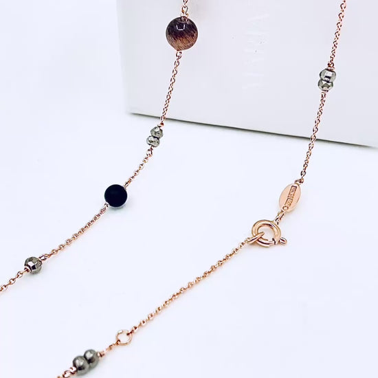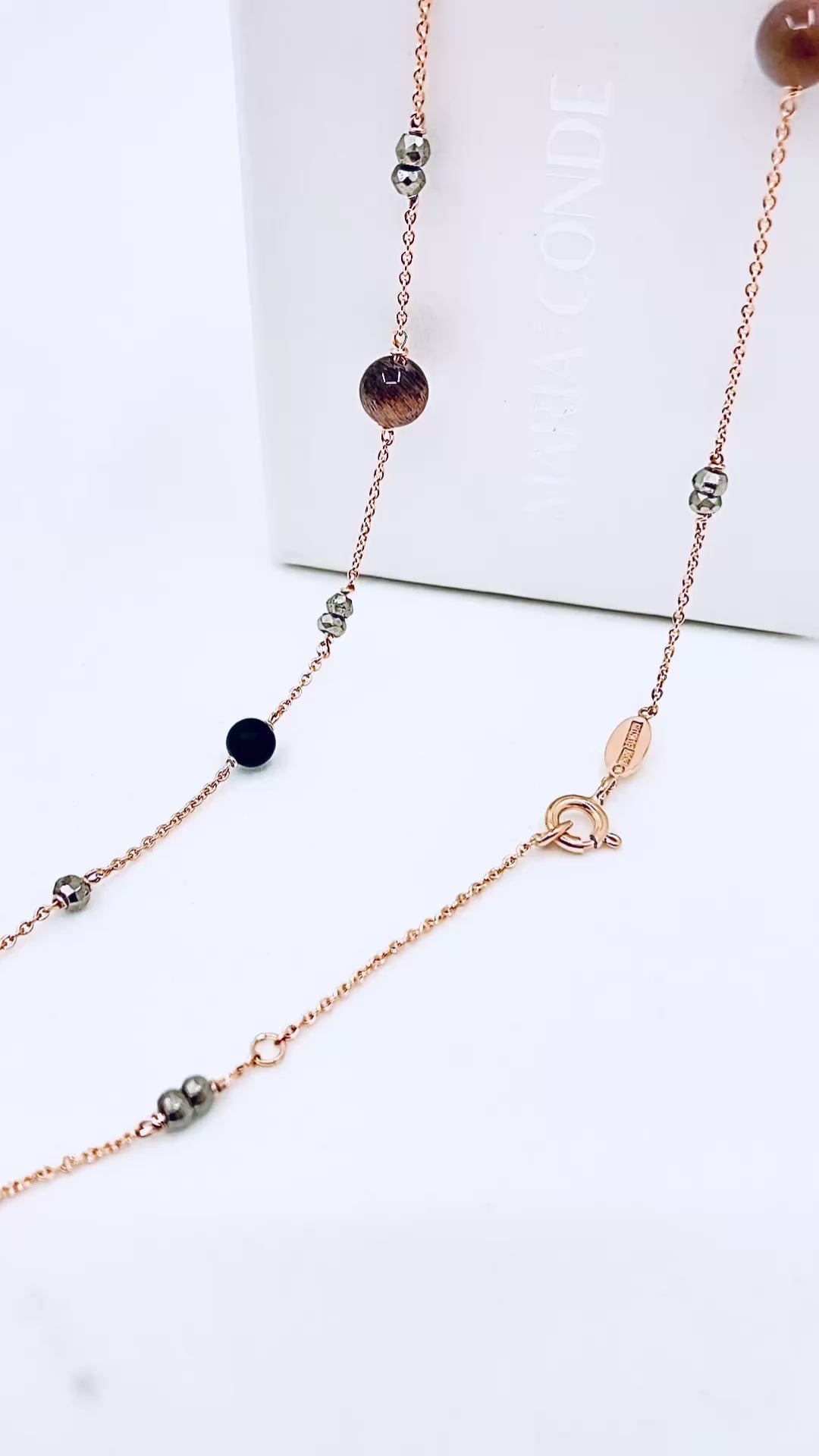 Tidlöst halsband där rödguldets färg harmoniserar och är en vacker kontrast till stenarnas grå, bruna och svarta toner.