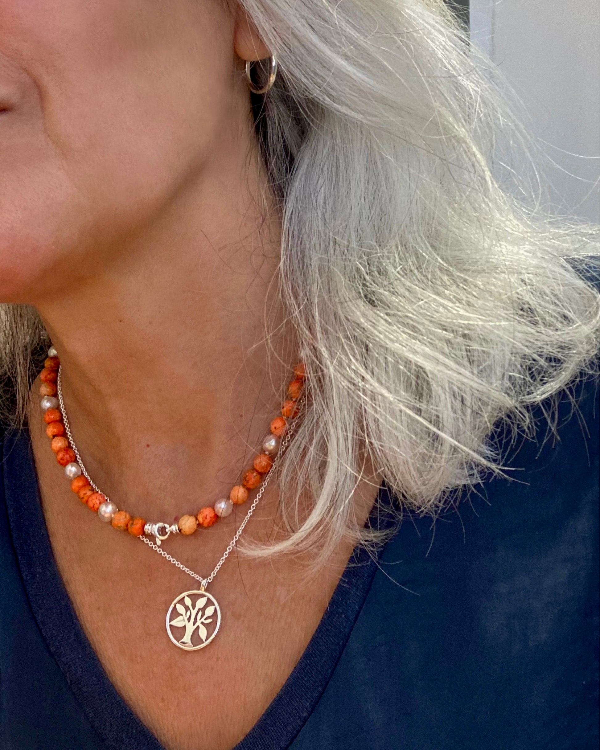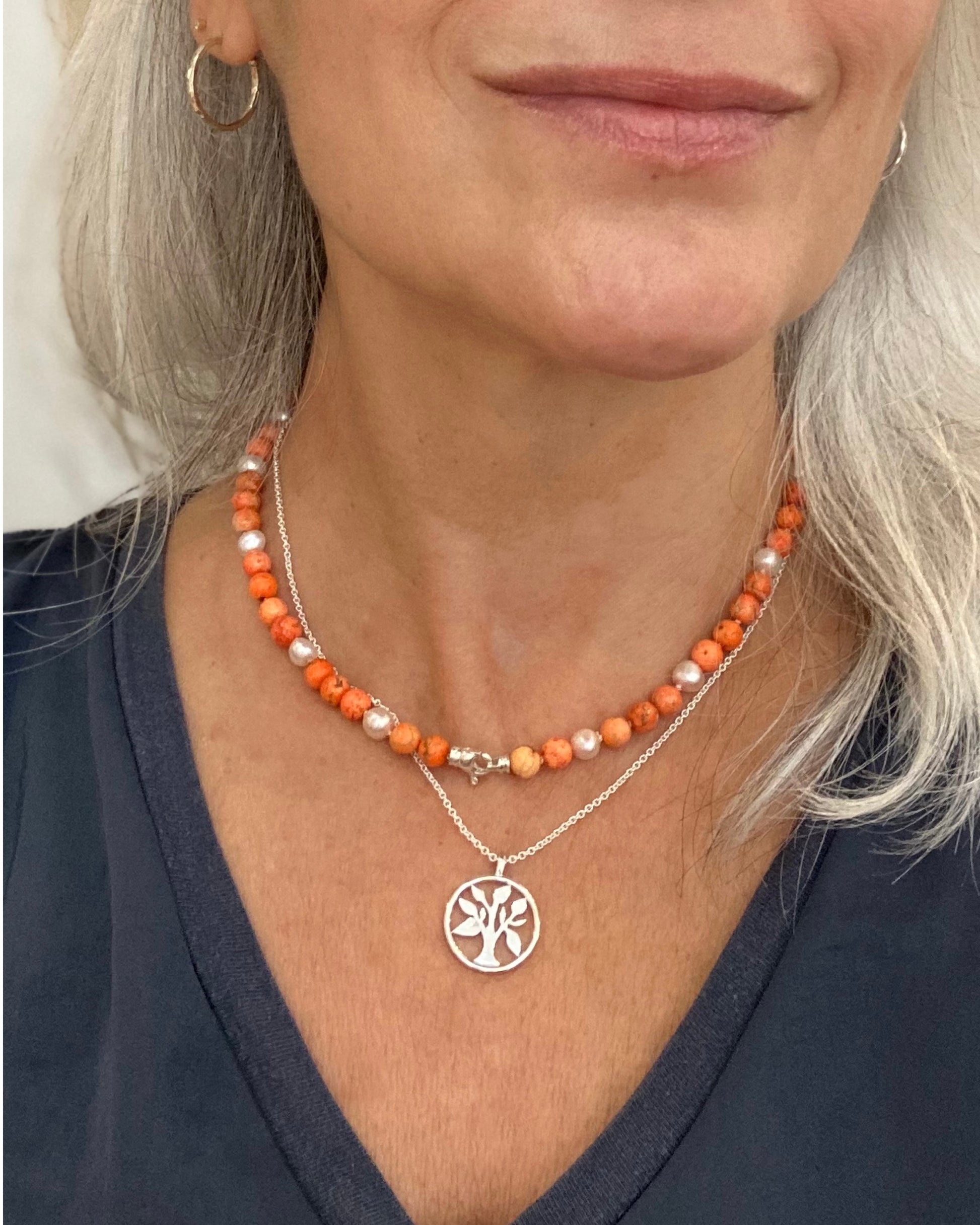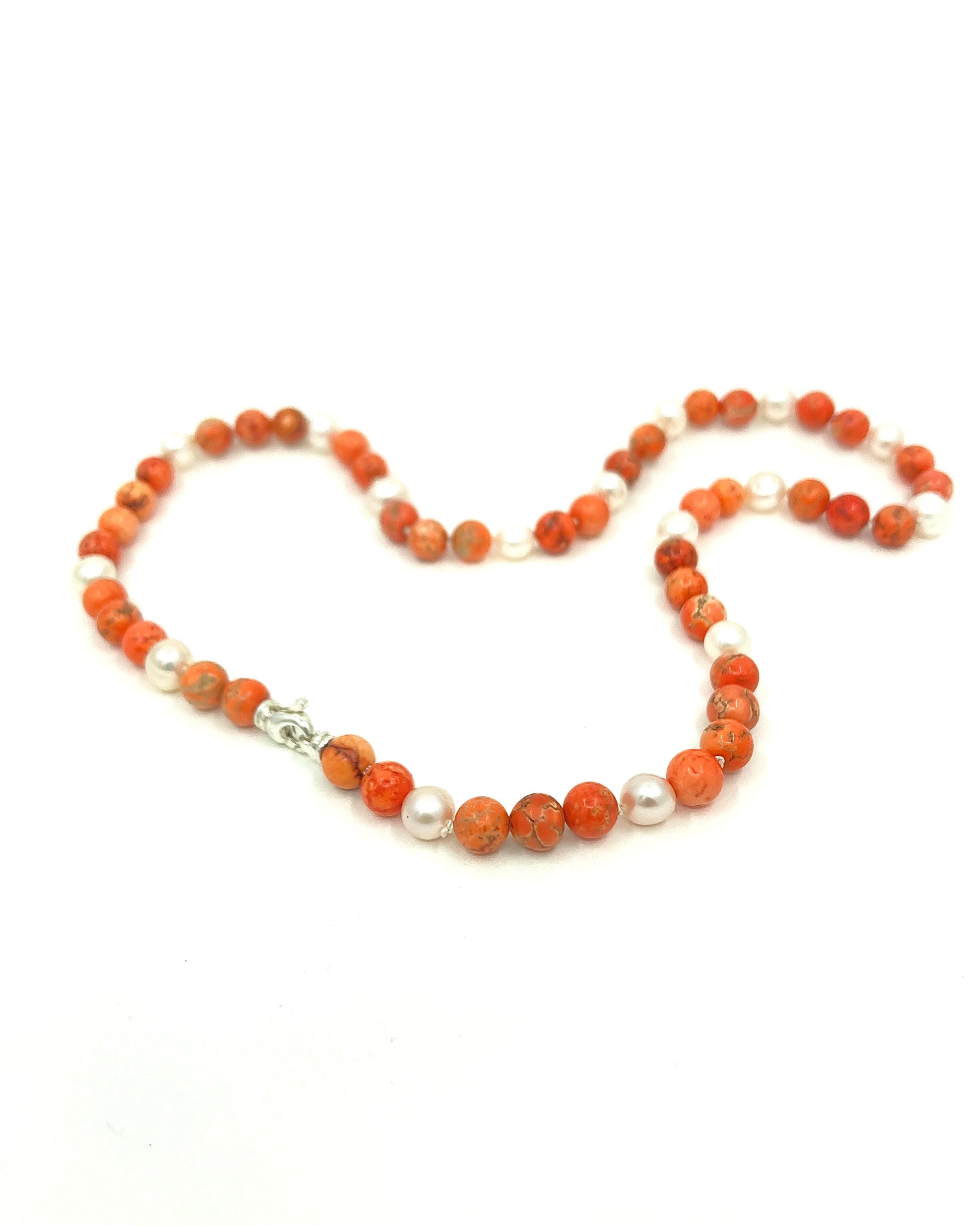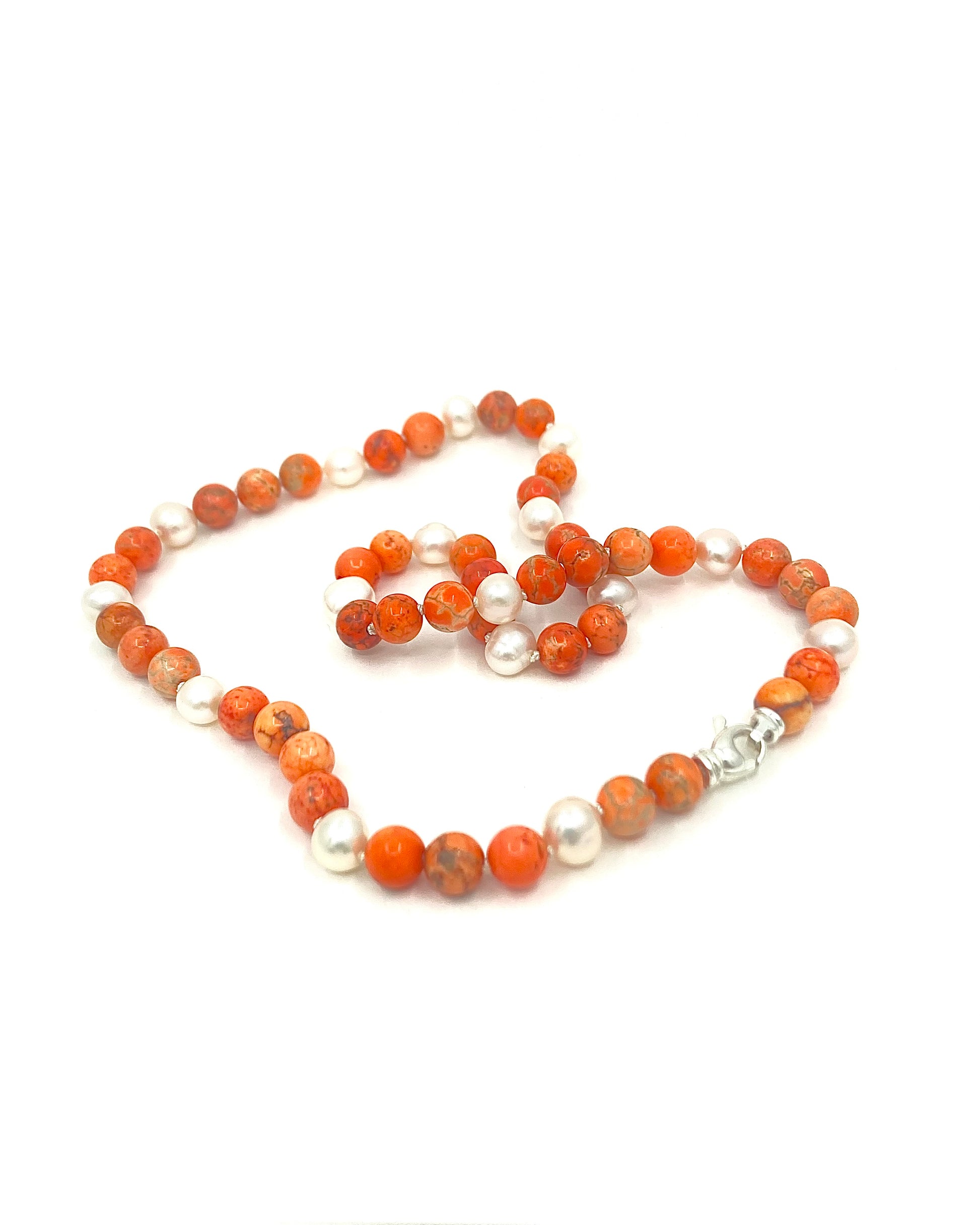 Nytt collier med härliga orange toner av magnesiter i vacker kontrast till de vita sötvattens pärlorna samt det snygga lite kraftigare låset i 925 sterlingsilver.